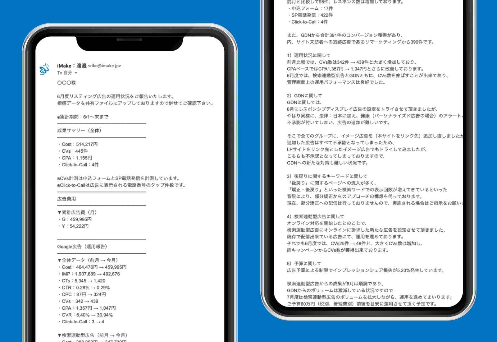 1ヶ月ごとの成果や運用状況を担当者がメールでお送りします。前月や前年同月と比較してどのような状況か、課題に対してどのような対策い結果はどうだったのか、など詳細にご報告します。